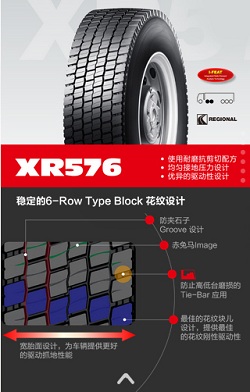 XR576使用耐磨抗剪切配方、均勻接地壓力設(shè)計(jì)以及優(yōu)異的驅(qū)動(dòng)性設(shè)計(jì),寬胎面的設(shè)計(jì)為車輛提供更好的驅(qū)動(dòng)抓地性能。同時(shí)采用更加穩(wěn)定的6—Row Type Block花紋設(shè)計(jì),包括防夾石子Groove 設(shè)計(jì);赤兔馬Image;防止高低臺(tái)磨損的Tie—Bar應(yīng)用。
