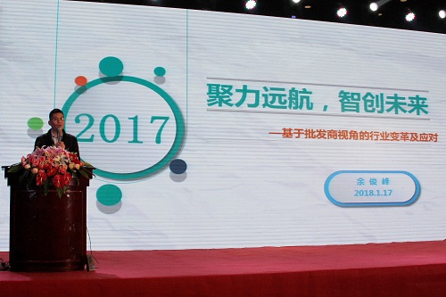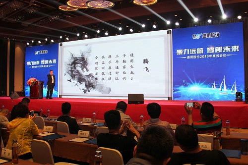 榮成市隆通貿易有限公司總經理張黎明在大會上作了題為“騰飛 2018”的主題演講,他從定位、服務、客戶管理三個渠道入手,向與會者分享了成功的營銷經驗和營銷體系構建案例,為代表們日后在市場上攻城拔寨提供了可實施性的參考經驗。