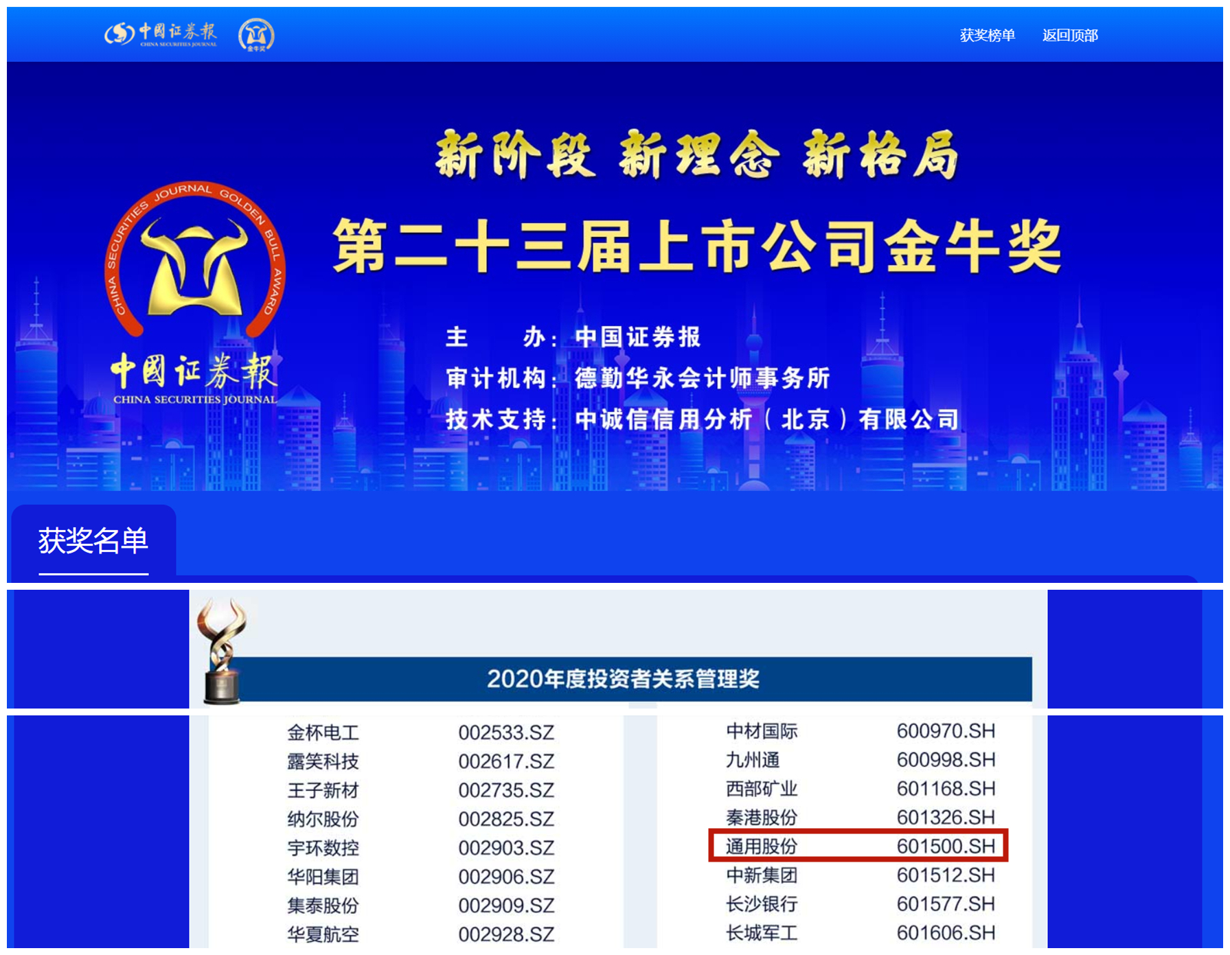據(jù)了解,金牛獎(jiǎng)是中國證券報(bào)鼎力打造的金融品牌,旨在公開、公正、公平原則下,表彰上一年度業(yè)績優(yōu)秀、治理卓越、具有崇高使命和社會(huì)責(zé)任感的上市公司。自1999年創(chuàng)立以來,金牛獎(jiǎng)評(píng)選已至第二十三屆,是中國資本市場(chǎng)最具影響力的獎(jiǎng)項(xiàng),在中國資本市場(chǎng)中具有上市公司“奧斯卡”的美譽(yù)。